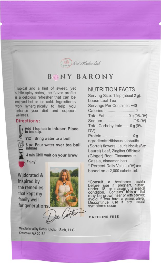 Inspired by a New Orleans slang term for "skinny" and handcrafted with four powerful organic ingredients, the Bony-Barony Herbal Tea is designed to help you pursue your wellness and dietary goals. This vibrant, naturally flavorful blend is perfectly balanced to support your daily regimen.